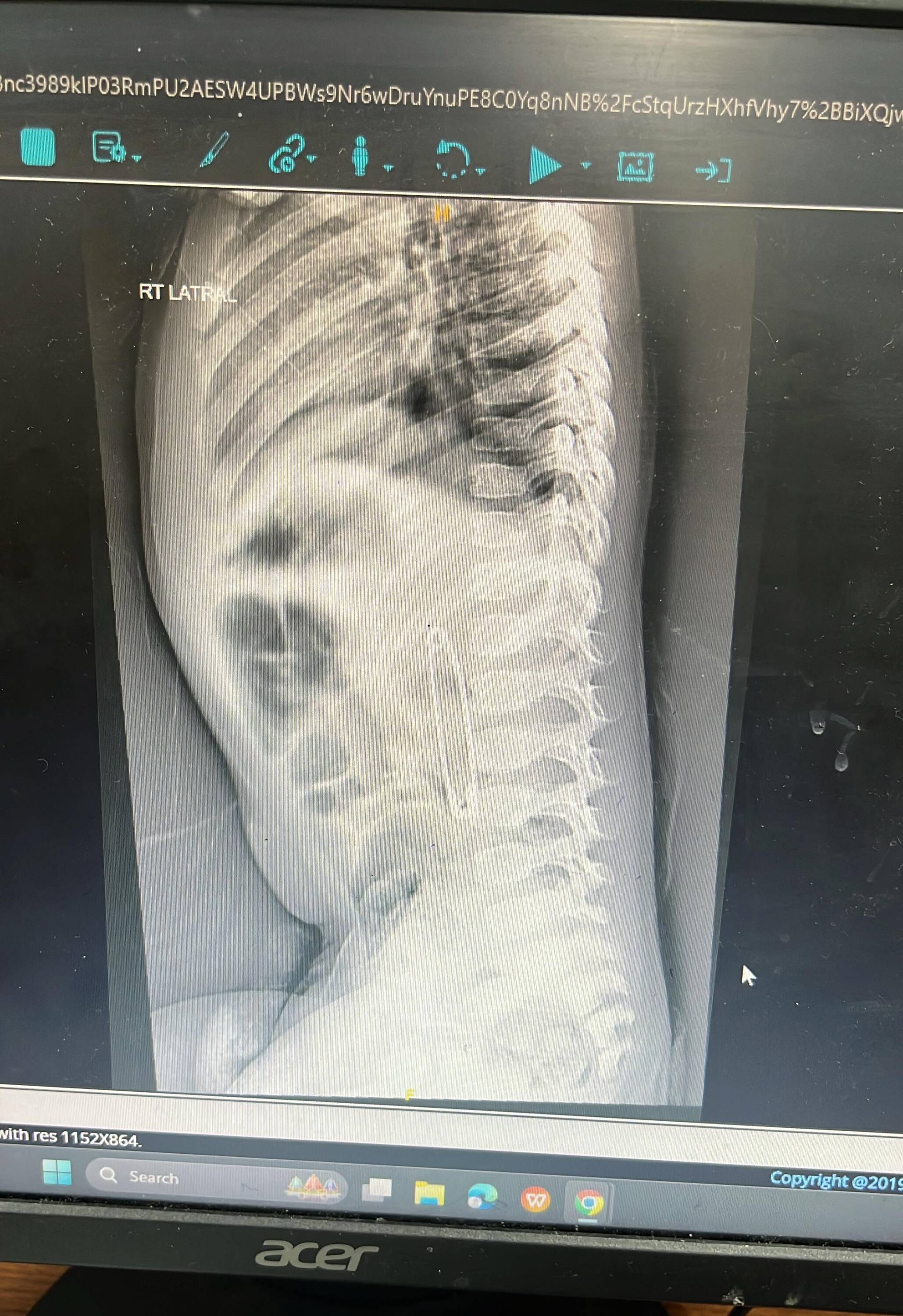 - X-ray confirmed the presence of a foreign metallic object (safety pin) in the gastrointestinal tract