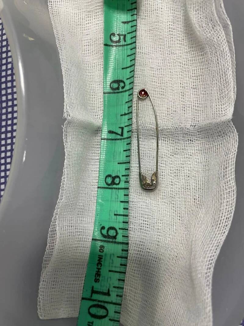 The infant was brought to the Emergency Room (ER) after the accidental ingestion of a large metal safety pin the previous day at around 5:00 PM while playing.